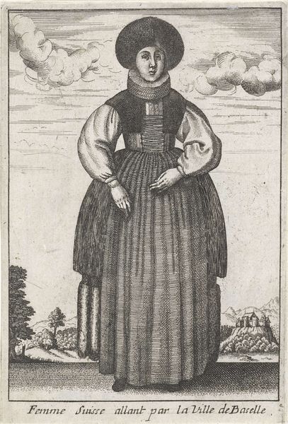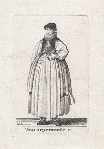 Wenceslaus Hollar created this etching, "Mulier Basiliensis," in 1644. Note how the composition is dominated by the figure, centrally placed and rigidly posed. The fine, precise lines articulate the textures of her garments, from the soft fur hat to the intricate folds of her dress. The geometric and linear precision divides the figure into distinct segments, almost as if dissecting the cultural identity of this Basel woman through the material representation of her clothing. The details of her attire, from the high collar to the layered skirts, aren’t merely decorative but serve as signifiers of status and regional identity. Hollar uses line and form to construct not just an image, but a statement about cultural representation. "Mulier Basiliensis" prompts us to consider how identity is constructed, consumed, and communicated through visual culture.