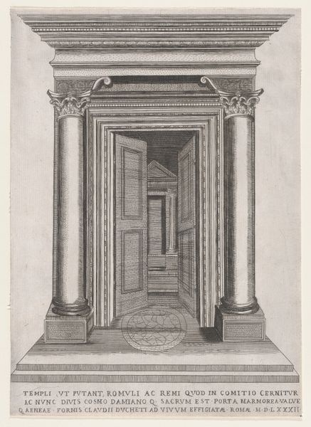 Curator: Before us is “Doorkijk van deuren,” or “View of doors,” created between 1670 and 1676 by François Chauveau. It's an intaglio print, showcasing the Baroque interest in perspective. Editor: My immediate response is one of awe. The depth achieved through a simple doorway, repeating into infinity almost, is rather striking in its geometry. There is a certain austerity and lack of visual information in its execution, which draws you into the pattern itself. Curator: Indeed. The doors evoke the absolutist power structures that were crystallizing across Europe during the late 17th century. Each successive doorway is carefully and richly decorated to create not just a feeling of architectural awe, but a subtle reinforcement of hierarchy and access. The fact that they seem to extend on forever also emphasizes the social inaccessibility for most to the center of this architecture. Editor: From a formal perspective, the print method itself, with its rigid lines and calculated use of light and shadow, augments this feeling. Consider the cold tonality of the grays, and the absence of color creates a measured, almost clinical detachment, enhancing the spatial illusion, though minimizing individual expression. Curator: Precisely, though these prints weren’t necessarily intended to have individual expression but served to reinforce the architectural power that underpinned a newly modern state. These images helped shape political realities as much as mirroring existing conditions of power. Editor: So you’re arguing its artistic value lies not solely in its aesthetics but in its power as a symbol and documentation of its socio-political background. A formal reading does inevitably lead one to this line of interpretation. I cannot imagine that I would feel the same had this been made by different hands. Curator: A final point to keep in mind: works like Chauveau’s also shaped how spaces were perceived in that period—how spaces might enforce distance but also performatively demonstrate majesty and seemingly endless possibilities. Editor: A fascinating dialogue of design and its function as political stagecraft, truly! Thanks to you for your wonderful thoughts. Curator: Indeed. Thank you for helping us explore this unique confluence between formal and historical insights.