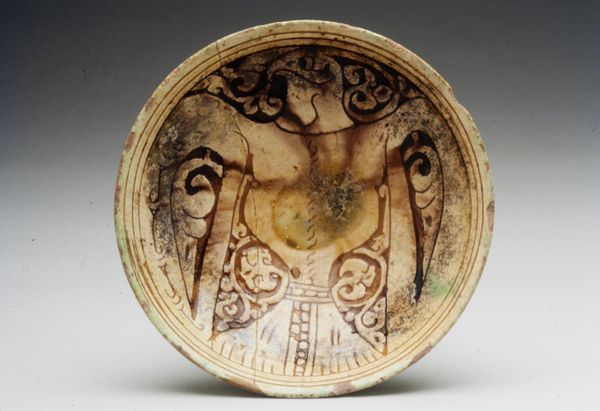 Curator: Right, let’s take a closer look at this ceramic bowl adorned with an abstract design. It's dated to the 9th or 10th century and is part of the Minneapolis Institute of Art's collection. Notice anything striking about it at first glance? Editor: Well, immediately, it has this slightly eerie face staring back. Like a forest spirit caught in clay. A blend of the geometric and something organic… and dare I say, slightly judgmental? Curator: "Judgmental"—interesting. Let's consider its construction. The material is relatively simple, just earthenware, and it speaks to the prevalence and availability of clay as a core material culture across civilizations, especially within domestic settings. Notice the stark contrast between the pale backdrop and the dark pigment outlining what seems to be this stylized, anthropomorphic figure, hinting to its functional and decorative role in daily life. Editor: You know, seeing the "face," it sparks this vision of communal meals, the bowl sitting center stage, holding…well, I imagine something flavorful and spicy, given the sharp visual accents! I am particularly drawn to how the repeated leaf patterns create a sense of enclosure or even protection for this central "face," right? It reminds me that form follows function, sure, but it also holds a story. Curator: Absolutely, this dynamic highlights abstraction in Islamic art. You know, strict interpretations of religious text limited representational figuration and Islamic art then blossomed into geometric and abstract modes like the geometric patterns of these designs which could also function to transmit cultural narratives through visual form. This piece really questions those limitations and allows art production to evolve organically out of cultural context. Editor: Mmh, to know this bowl once felt the heat of a kiln and now holds space in a museum…there’s a quiet journey in that transition. Maybe "judgmental" was the wrong word… Perhaps its expression is better characterized as wise and all-knowing. Curator: Precisely! Its transition speaks to the endurance of crafted objects as cultural carriers that also have an exchange with us as they're looked at in time. Thanks for adding color to the description of the process that really brought this bowl from being raw materials into a work with rich history.