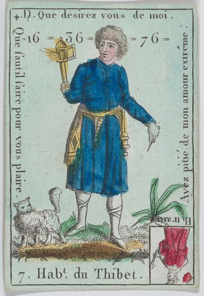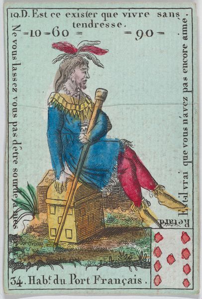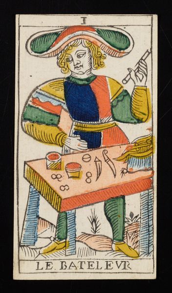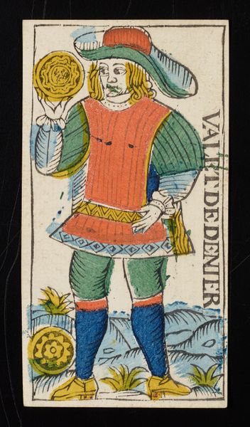 Curator: I find this image striking. We're looking at the "Page of Swords", an etching crafted by Claude Burdel around 1751. It is currently held in the Minneapolis Institute of Art. Editor: Yes, it’s hard to miss! At first glance, the colour palette, almost like a stencil print, draws me in, despite its relative simplicity. He almost looks mischievous, a young man poised between worlds with that sword held upright. Curator: The image forms part of a larger cultural object: a deck of tarot cards. Its arrival in Europe has long been speculated upon, with the cards’ association with divination linked to a rich social history. As we explore the history of tarot, what do you make of this particular 'page' archetype within this visual tradition? Editor: Well, thinking about representation, this ‘page’ figure complicates archetypes and class dynamics. Look at how his garments signal noble status, the bright clothing and the weapons that mark him out, and notice his somewhat haughty look. The character feels ambivalent and speaks to constructed identities—and reminds us who possesses cultural power in these settings. Curator: That’s a valuable reading. This specific tarot design and printing—and the way the card itself signifies change and watchfulness—resonated profoundly during a turbulent 18th century on the cusp of modernity. Editor: Indeed, if we frame this through gender studies, this "Page" could reflect the expectations put on young men within that era. What type of societal expectation do you believe he might reflect within this specific print? Curator: It certainly encourages us to reconsider masculinity—the performative nature of the attire and gesture speaks to this as much as anything else. This era, marked by social stratification and revolution, provided contexts ripe for questioning roles. Editor: Absolutely. For me, seeing the "Page of Swords" prompts deeper engagement with the power dynamics embedded within the imagery. This extends beyond pure artistry into spheres of cultural symbolism, class conflict, and complex representation. It encourages considering social critique and what may underpin society. Curator: Indeed, its preservation highlights the importance of analyzing images as products shaped by forces much bigger than the artwork, prompting insights across philosophy, theory, and studies focused on cultural impacts. Editor: A great reminder of art’s unique power!