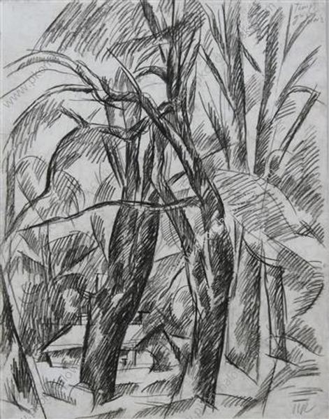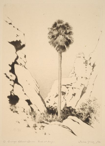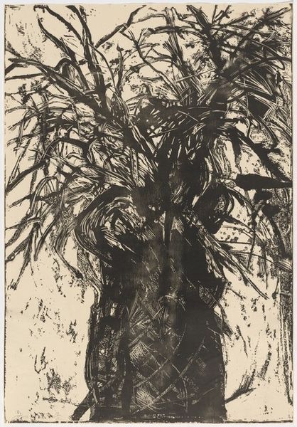 Editor: Jim Dine’s "Shooting-Star," created in 1984, appears to be an etching or graphite drawing, and what strikes me is the contrast between the detailed texture of the palms and the almost chaotic network of lines in the background. How do you interpret this work? Curator: Well, observe how Dine employs line here. The density varies significantly, doesn’t it? In the lower portion of the work, we find an almost aggressive application of graphite or etching, creating a weight, an undeniable groundedness. Compare that to the delicacy, the relative sparsity, of the lines that form the palm fronds and the background. Notice the texture achieved—almost feathery in places. What does that juxtaposition suggest to you formally? Editor: Perhaps a deliberate imbalance? The heavier base contrasts so strongly with the lighter, almost ethereal top, that it creates tension, visually anchoring what might otherwise float away. Curator: Precisely! Consider the "background," those seemingly random lines. They're not simply background, are they? They interact with the central forms. These etched marks define and confine the representational palm tree using what could be interpreted as semiotic language. They carve the palm into a specific form through visual constraints, delineating space and contributing to its material form. They provide an alternative context in which we are allowed to "see" the tree. The success here relies not on accurate rendering of space and objecthood but rather relies on creating meaning through symbolic lines and etching techniques. Editor: So it's the interplay of these formal elements—line, texture, contrast—rather than a representational goal, that defines the work? Curator: Exactly. And remember that the title "Shooting-Star" is not descriptive. It prompts one to view how such titles act in art and how a change of the work’s title impacts its interpretation. Ultimately, our interest here hinges on understanding this semiotic structure. Editor: I never thought about it that way before. Looking closely at how Dine uses the lines to construct the image has really opened my eyes. Curator: Mine as well, let us reflect more on his portfolio now!