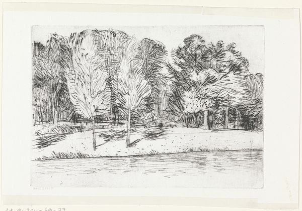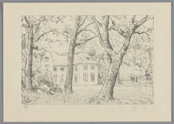 Editor: We're looking at Simon Moulijn's "Gezicht op het landhuis van buitenplaats Cromvliet," a pencil drawing from 1927 housed at the Rijksmuseum. It’s a pretty traditional landscape sketch, but there’s a real stillness to it that grabs me. The way the house sits framed by the trees...what do you see in this piece? Curator: Stillness is a lovely word for it. It feels like peeking into a memory, doesn’t it? I'm immediately drawn to the light. Notice how Moulijn uses varying pressure with the pencil to capture the dappled sunlight filtering through the leaves. It’s not just about rendering the house; it's about capturing a specific moment, a fleeting experience of light and shadow. Editor: Definitely! It almost feels like a photograph, but softer, more intimate. Curator: Exactly! Before photography dominated how we perceive and record landscapes, these drawings held a lot more weight as documentation. But I think Moulijn's work goes beyond mere recording. He's injecting emotion, capturing a certain "sense of place," a feeling of nostalgia perhaps. What does the landscape suggest to you? Editor: It makes me think of a secluded, quiet retreat, a place to escape. Is it maybe romanticizing that kind of lifestyle? Curator: Possibly! There’s a distinct turn-of-the-century longing for nature, a retreat from industrializing society bubbling under the surface. The careful composition, that subtle balance of light and dark...it’s more than just a casual sketch; it's an idealized vision. Editor: I never thought about the industrialization aspect of it! It really changes how I look at it. Curator: That’s the magic of art, isn’t it? Always more to discover, layer upon layer. I love how a seemingly simple sketch can hold so much history and emotion. Editor: Me too, that really opens my eyes to the time it was created. Thanks for your thoughts!