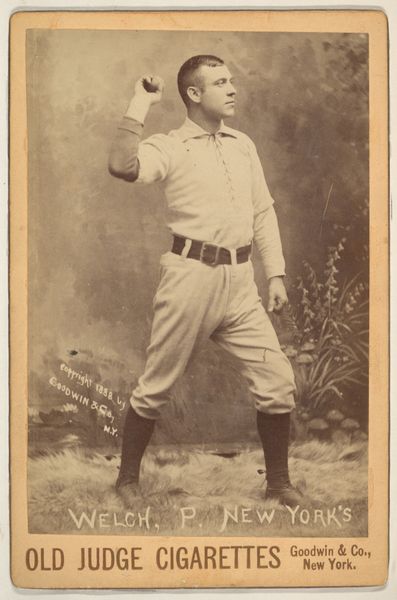 Editor: Here we have "Henry P. Easterday, Shortstop, Cleveland" from the Old Judge series, made in 1888 by Goodwin & Company. It’s a print, and feels very much like a snapshot in time, like one of the earliest baseball cards. What strikes you when you look at this photograph? Curator: The figure's stance and presentation are quite intriguing from a formal perspective. Note the deliberate arrangement of the figure against the relatively flat background, and how this contrasts with the textural elements—consider the interplay between the baseball glove, uniform, and the soft-focus rendering. Observe how the lighting contributes to a subdued tonal range. Do you notice how that palette and staging work together? Editor: Yes, it's definitely restrained, almost muted. It brings a stillness to the potentially action-packed scene. The sepia tones also seem to flatten the space. It seems more concerned with pose than conveying movement. Curator: Precisely. The lines formed by his body and arms create a closed composition, drawing attention inward. Consider how the verticality of the figure is grounded by the horizontal line of his belt, and the gaze directed away suggests narrative potential, or perhaps...staged artifice. Do these observations lead you to consider anything else? Editor: It makes me wonder if this 'natural' pose is entirely constructed, composed simply for its visual appeal. I hadn't considered the horizontal balance of the belt, but seeing it now gives more dynamism to the piece. Curator: Absolutely. This tension between constructed image and real moment offers us insight into late 19th century photography and its evolving artistic status. This photo straddles the line, reflecting an effort to legitimize the medium. Editor: That’s fascinating, I will certainly think more about composition in photography moving forward!