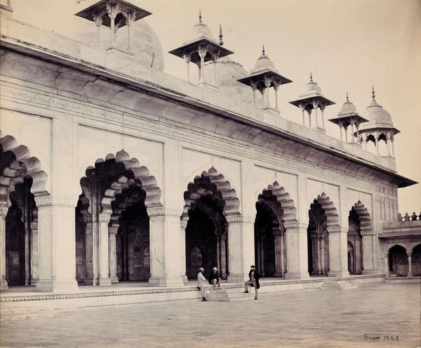 Editor: Here we have Samuel Bourne's "Gezicht op de Moti Masjid in Agra," a gelatin silver print dating from around 1864 to 1866. It feels so still, so meticulously composed. How do you interpret this work? Curator: I see more than just a tranquil cityscape; I see a potent representation of power dynamics inherent in 19th-century Orientalist photography. Bourne, as a British photographer in India, inevitably framed his subjects through a colonial lens. Editor: So, the framing itself is a statement? Curator: Precisely. The photograph aestheticizes the Moti Masjid, rendering it a picturesque object for Western consumption. Consider how the figures within the scene are relegated to the background, seemingly dwarfed by the architecture. Whose narrative is being privileged here, and at whose expense? Editor: I hadn’t thought of it that way. It does seem to prioritize the building as an object over the people within it. Is there a sense of exoticism at play too? Curator: Absolutely. This image participates in a broader discourse of constructing the "Orient" as both alluring and inferior. The photograph isn’t just a neutral depiction; it reinforces colonial power structures. Can we look at Bourne's work critically, acknowledging its artistic value while simultaneously interrogating its ideological underpinnings? Editor: That's a really important point. It is beautiful, but we can't ignore the context in which it was made. I guess looking at art this way, as more than just something aesthetically pleasing, really makes you question everything about it. Curator: Precisely. This is how we can make art history relevant and use it as a springboard to talk about urgent sociopolitical issues of today.