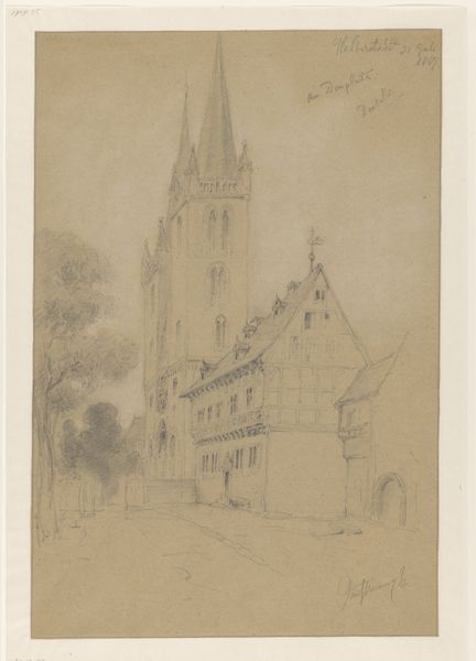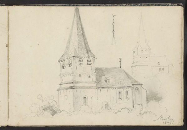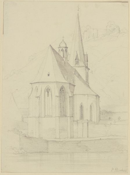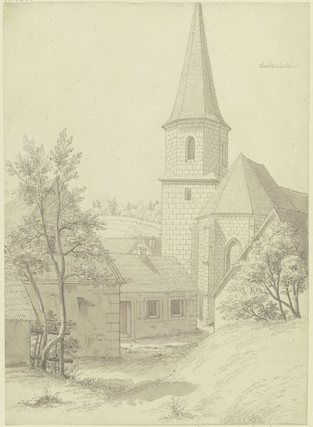 Curator: Karl Ballenberger, though a somewhat obscure figure, crafted this evocative rendering of Schloss Schwarzenberg, likely in the 19th century. Look closely to notice the exquisite detail brought to life through pencil, ink and etching on paper. Editor: The sheer delicacy of the lines gives the piece an almost dreamlike quality, wouldn't you agree? It feels very gentle. The way the building is positioned—perched on that hill—also lends it a sense of dominance over the surrounding landscape, despite the medium's subtlety. Curator: Indeed. Architecturally, Schwarzenberg Castle itself bears symbolic weight. Think of castles; what do they project? Protection, certainly. Rule and tradition. The architectural details—that imposing tower, the surrounding walls—they echo centuries of aristocratic power. Editor: Structurally, I’m fascinated by how Ballenberger uses the stark contrast between the finely detailed castle and the more vaguely defined landscape to guide the eye. It creates a powerful focal point. Almost like a signifier. Curator: Precisely! The stark lines emphasize the castle against the natural world. A world presented almost in hazy afterthought. Perhaps signaling a human, societal assertion of order, purpose, against what might have been viewed as chaotic nature. It suggests civilization. Editor: Yet, it also evokes a sense of isolation. Despite its structural grandeur, the castle seems almost vulnerable atop the hill, softened by the etching technique. Like it's dissolving into the light. Curator: It invites contemplation, perhaps, on the impermanence of even the most imposing structures. The image isn’t merely documentation, but a gentle, melancholic reflection on time and authority, told through iconography. Editor: Well, Ballenberger’s understated palette invites our introspection as well. What begins as observation ends as gentle immersion within the history that is still standing today. Curator: I’ll carry the castle’s gentle sense of standing against time and all that entails long after our conversation is done. Editor: Absolutely. It's in its visual humility that this piece presents to its audience a feeling that time carries on and it is standing there along for the ride.
