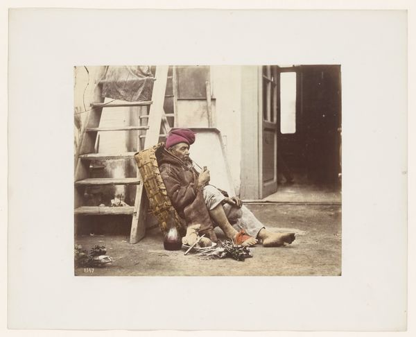 This hand-colored albumen print is from an anonymous photography album, and it presents an image of labor and life in Japan. This image gives us insight into the class system and the economics of Japan. Here, the hand coloring enhances the detail of the subject’s clothing and the goods he carries. His worn sandals and the visible strain on his face speak to the difficult conditions faced by the working class. The traditional Japanese house in the background anchors the figure in a specific cultural context. The figure’s position, burdened and bent, subtly critiques the social structures of the time. To understand this photograph better, we can research the economic conditions in Japan during the late 19th century, and explore the rise of photography as a tool for documenting social realities. This image encourages us to consider how art can be a powerful form of social commentary, reflecting and challenging the norms of its time.