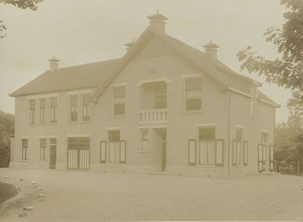 Editor: Here we have an older photograph by Geo R. Lawrence Co. titled "Social Settlements: United States. Illinois. Chicago. 'South Parks': Sherman Park." The symmetry of the landscaping is striking. What catches your eye? Curator: Note the tonal gradations, from the stark foreground shadows to the softer, diffused light illuminating the building's facade. Observe how the artist uses the verticality of the trees to frame the horizontal expanse of the building. Do you see how that contrast emphasizes the constructed nature of the park within its natural setting? Editor: That's a really interesting point. I hadn't considered the formal elements communicating that idea. So, it's not just a picture OF a park, but ABOUT the park? Curator: Precisely. The photograph becomes a study in contrasts: light and shadow, natural and man-made. Through these formal devices, the photographer reveals the park as a designed space, mediating between nature and society.