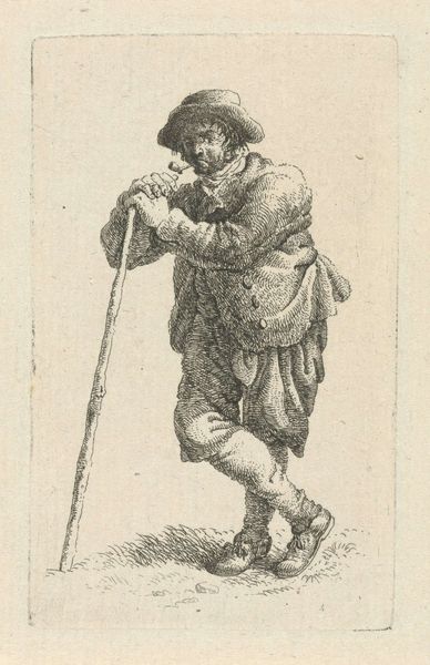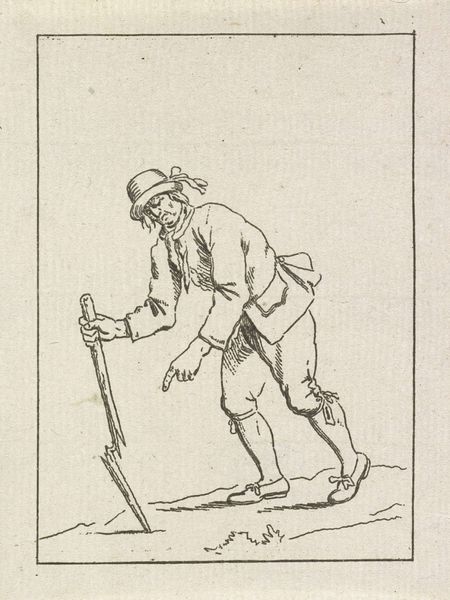 Editor: Here we have Pieter de Mare’s “Man leunend op stok,” a pen and pencil drawing on paper from between 1777 and 1779, housed at the Rijksmuseum. It's a pretty simple sketch of a man leaning on a walking stick... sort of comical. What do you see in this piece? Curator: I see a representation of labor, of class, and perhaps even resistance embedded within what seems like a simple sketch. Think about it: this is the late 18th century. How are working-class individuals represented, and by whom? De Mare offers a glimpse into a life often unseen, uncelebrated in mainstream art. The figure's posture, his worn clothing – they speak to a daily grind. Editor: So you're saying it's more than just a random drawing? Curator: Precisely. The 'genre-painting' aspect is critical. De Mare's drawing challenges the period's artistic norms by giving visibility to everyday existence, offering, even if subtly, a challenge to established power dynamics. Think about how the ruling classes might perceive such an image. Editor: That’s interesting. I never would have thought of it that way. Does the fact that it’s a sketch influence that? Curator: Absolutely. The sketch format can be seen as immediate and unfiltered, contrasting the polished, often propagandistic portraits of the elite. It humanizes its subject outside the established systems for legitimizing individuals. Editor: So the drawing becomes almost like a political statement? Curator: Exactly. Art doesn’t exist in a vacuum. Looking at art through an intersectional lens makes even the simplest sketch resonate with potent historical and social meaning. Editor: Wow, that really changed my perspective! It's amazing how much context can impact the way we see something. Curator: Indeed! It shows that the personal is always political, even in art.