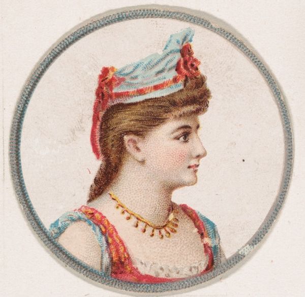 Editor: This is Maud Branscombe Dressed as Dancing Girl of Africa, a print made with coloured pencils, dating back to around 1888-1890. It’s a card that was part of a cigarette brand collection. The composition feels a bit flat, doesn't it? What do you make of the artistic choices in this piece? Curator: Indeed. The two-dimensionality you perceive is central to understanding this work. Observe how the artist employs a limited colour palette and distinct outlines. The planar rendering eschews traditional modelling techniques, emphasizing surface and pattern over illusionistic depth. Editor: So, the lack of depth is intentional? Curator: Precisely. Focus on how the costuming elements interact with the figure. Note the geometric construction of the headdress and how its shape is echoed, albeit simplified, in the collar design. Does this echo generate any symbolic resonance, would you argue? Editor: I hadn't thought of that. It almost looks like the collar frames the face in a similar way the headdress does...maybe emphasizing a particular image? Curator: Precisely. Such careful repetition and arrangement of forms indicate a self-referential artistic system at play. This, combined with the print’s function as a collectible item, points toward a complex interplay between representation, consumption, and artistic intent. Editor: That's fascinating. I was so caught up in the, let's say, presentation, I didn't consider the relationships of shapes as deeply. Curator: Considering the interplay between form and function unlocks critical avenues into appreciating such works. This has been a good chance for me to reconsider too.