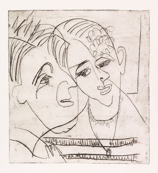 Curator: This striking ink drawing by Max Beckmann, created in 1920, is titled "Mr. Muller, I and the Barmaid". Editor: It's instantly claustrophobic, isn't it? That huddle of faces... there's a kind of aggressive intimacy to it, heightened by the stark black and white. The perspective is so tilted; the effect is off-kilter. Curator: Beckmann often used portraiture to explore the fragmented psychological states prevalent in Germany after World War I. Look at the exaggerated features, almost caricature-like, that push this past simple representation. The stark lines of the ink and the tilted perspectives all intensify emotional turmoil and cultural anxieties of the era. Editor: The repetition of lines feels anxious, like an agitated etching into the surface. I’m intrigued by the gaze, or rather the absence of it. They seem disconnected, absorbed in their own worlds within this shared space. There's a definite sense of alienation even among people clustered so closely. I suppose, the title does clarify who these people are, yet not their specific relation. Curator: The bar setting would be a space where social masks are both donned and shed. Remember this piece comes from a larger portfolio titled “Hölle” – or "Hell". So this is more than a bar scene; the choice of this setting suggests this is some kind of netherworld, perhaps for the psyche itself. Editor: I hadn't made the connection to the "Hell" portfolio. That adds another layer to my experience of this artwork! I’m no longer merely witnessing a mundane interaction but an allegory of postwar disillusionment. The image morphs from a candid snapshot into a mirror reflecting the collective trauma of an era. Curator: Exactly! The figures are symbolic containers, each carrying a part of this emotional weight, amplifying it together, the picture acting like an emblem of wider trauma. Editor: Looking at this work has certainly shifted my perception. At first, it felt chaotic, yet recognizing it within its historical and symbolic context brings a kind of somber order. Curator: For me, I think the piece makes a broader claim: how public spaces are shaped by social realities and also private suffering and anxiety. A good, troubling work!