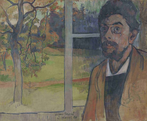 Curator: I’m struck by the somber mood, actually. There's something almost oppressive about the flatness of the colors. The sunflowers, which are so typically symbols of joy and vitality, appear almost… weary. Editor: Here we have an unusual portrait titled "Vincent van Gogh painting sunflowers." Although undated, it’s been attributed to Paul Gauguin. A fascinating oil on canvas, impasto provides a pleasing texture. What is it about the sunflowers you're reacting to? Curator: It's the heaviness, maybe the earth tones intermingled with the yellows. Sunflowers are traditionally associated with adoration, vitality and longevity –think of Van Gogh’s explosive series! Here they feel muted. There’s an internalization of creative vision perhaps, maybe struggle. Van Gogh looks equally dour. Editor: Absolutely. Consider the sunflower’s symbolism during this period. It goes beyond simple happiness, reflecting Van Gogh’s own artistic ambitions, even his spirituality. Seeing him painted alongside his own famous subject—is there perhaps an indication about the state of art? Curator: I think so. I also think Gauguin is maybe saying something about artistic representation itself. The very visible brushstrokes and bold, bordering-on-unrealistic use of color create a reality that feels intentionally mediated, seen through a personality rather than depicting something tangible. And with van Gogh, always troubled, maybe those paintings are not full of joy at all. Editor: Exactly! And doesn't the painting invite considerations about the art market as well? By depicting van Gogh within this frame, he not only highlights a relationship, but elevates it. Curator: Very well. In my eyes, it also is the study of an artistic community—perhaps an expression about the changing understanding of an artist in modern society. Editor: So, we've journeyed from a surface-level somber tone to, I think, a deeper appreciation of the painting's layers. Curator: For me, it highlighted both personal and collective tensions within the art world and the shifting ground for how and why it mattered.