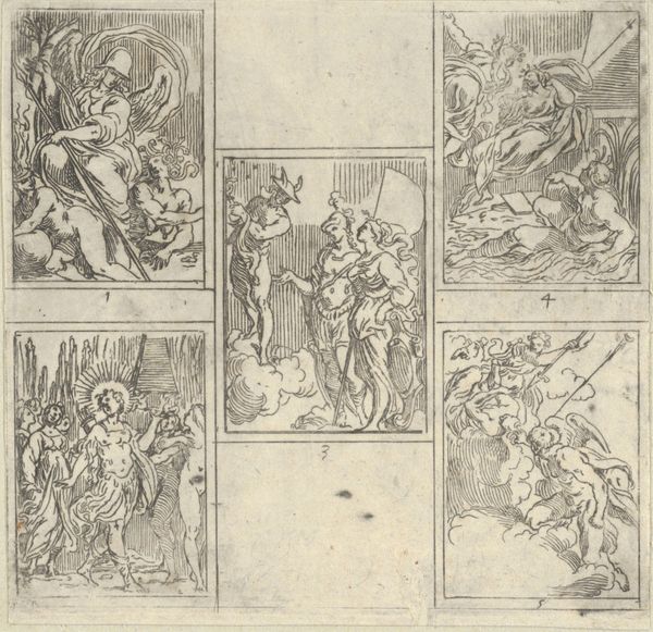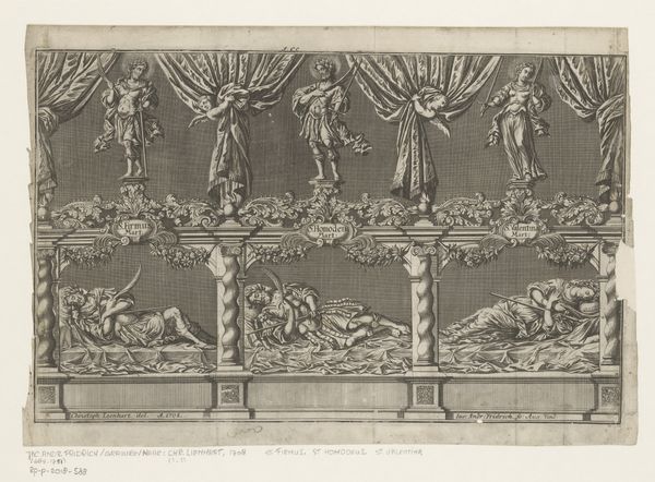 Editor: This is "Decoraties bij het huis van de heer D.A. Bisschop te Rotterdam, 1766," a print, an engraving to be exact, made between 1774 and 1776 by Noach van der Meer the Younger. It's at the Rijksmuseum. It looks like a series of symbolic panels… I am curious about what they signify, because it strikes me as pretty formal and symbolic. How do you interpret this work? Curator: Well, looking at these panels, I'm immediately struck by the heavy reliance on allegorical figures. Each panel is a carefully constructed symbolic language. We've got lions representing strength, angels perhaps alluding to divine blessing or fame, and classical figures suggesting justice and military might. Don't you see how each evokes a different kind of power and virtue? Editor: Yes, I see what you mean! And they seem related to the Bisschop family, given the title? Curator: Precisely. In the Baroque era, it was common for wealthy families to commission works celebrating their virtues and aspirations. Look closely – what do you notice about the central panel? Editor: It seems to depict a family or some people bringing their grievances to justice, there is a woman seated and an angel at her side and then other people. Is this panel supposed to show Bisschop’s commitment to justice and good governance? Curator: Excellent observation. Given the context and period, such displays were about conveying status and aligning the family with certain ideals: wealth, justice, and maybe a bit of worldly acclaim. It's interesting how personal identity was so intertwined with public image back then. Editor: That’s fascinating! It completely reframes how I saw this piece initially. Thank you! Curator: And for me, this image reinforces how symbols carry the weight of cultural memory. Justice isn’t only abstract but connected to class, family, and governance of society. It makes you question whose version of justice is displayed here, doesn’t it?