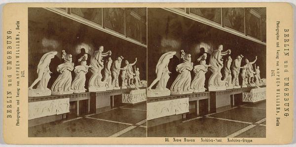 This stereoscopic photograph of the Niobid Group at the Neues Museum in Berlin, was captured by Johann Friedrich Stiehm. The almost monochromatic composition highlights the stark whiteness of the sculptures against the muted tones of the museum interior. This stark contrast draws the eye to the cluster of figures, evoking a sense of drama and tragedy. Stiehm's use of stereoscopy creates a three-dimensional effect, enhancing the viewer's perception of the sculptures' spatial arrangement and depth. The photograph not only documents the artwork, but also uses visual language to interpret the themes of suffering and divine retribution. Note how the formal arrangement, from the detailed rendering of the sculptures to the overall composition, serves to intensify the emotional impact and underscore the narrative power of the ancient myth. The image presents the Niobids as both aesthetic objects and cultural symbols.
