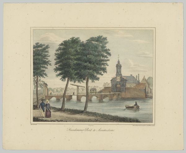Editor: This is "Stadsgezicht te Alkmaar" by Bernardus Gerardus ten Berge, likely created between 1862 and 1875. It’s a plein-air painting housed at the Rijksmuseum, depicting a cityscape. The colors feel muted and soft, creating a sense of gentle serenity. What strikes you most about its visual composition? Curator: The formal structure immediately grabs attention. Notice the meticulous arrangement: the dark verticals of the trees against the horizontal stretch of the city's architecture create a push and pull effect. Consider how the artist’s placement of the figures animates the immediate foreground, anchoring the viewer's gaze. How does the subtle coloring interplay with these structural elements to guide our interpretation of space? Editor: I see how the trees act as framing devices. But the perspective seems almost flattened. Curator: Precisely! This perceived flatness denies deep perspectival recession. Examine closely how the coloured pencil emphasizes surface texture rather than attempting photorealistic depth. Where does this lead our reading of “realism”? Editor: So it is realism through surface, through a commitment to texture instead of illusionism. Does the artist’s technique affect the mood this evokes? Curator: Undeniably. The layering of strokes emphasizes a methodical, almost detached observation. There’s a certain tranquility, stemming not from idyllic beauty, but from quiet attention to form itself. It reveals more about the structure of seeing than about any narrative it seems to depict. Editor: It’s like the act of observing becomes the subject itself! I now have a better understanding of the artistic construction. Thanks. Curator: Indeed. Thinking about this artwork prompts me to consider the value in art of structure over subject.