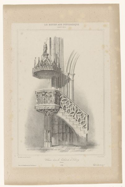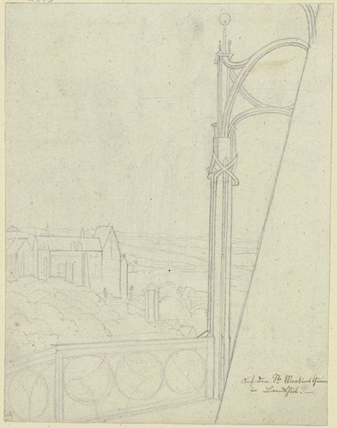 Curator: This drawing, entitled "Wrought Iron Railing," dates to around 1936 and appears to be rendered in pencil on toned paper. The artist, Thomas Byrne, captured what seems like a glimpse of a cityscape. What strikes you upon seeing it? Editor: Initially, I see a city steeped in history, rendered in a style evocative of architectural documentation. Yet, there is an undeniable stillness and feeling of being frozen in time. Curator: Indeed. Byrne's compositional choices lead the eye upward. Note how the precise lines defining the wrought iron create a compelling interplay of verticality and curvature. The architectural details, particularly the lamp post and the balcony, provide a visual rhythm. Editor: Looking closer, it also highlights urban divides. Wrought iron, signifying luxury, contrasts with what is "Conway's Court." It seems to gesture towards a segregation coded in urban planning. Can we know about Byrne’s socioeconomic position and what it afforded him to capture only specific details of the place in question? Curator: That is certainly an interesting contextual avenue. The focus is on line and form; the geometric exactness juxtaposed with the more organic feel of the aged paper itself creates a striking tension within the picture plane. He seems more fascinated by how light creates visual textures than on delivering a specific political argument, though I agree his choice to showcase one over another building certainly tells a deeper story than is visually represented. Editor: The seemingly simple image encapsulates the era's broader dialogues about urban design, class, and power dynamics. In an era marked by increasing inequalities, his work provides an opportunity to explore social stratifications inherent in urban landscapes. It offers layers of urban life worth exploring, prompting inquiries into how these realities persist to this day. Curator: From my point of view, while context does add dimension to its meaning, there's no denying the intrinsic harmony and visual appeal independent of sociopolitical subtext, giving more weight to what he chose to highlight aesthetically. The piece offers a certain formal pleasure, don't you think? Editor: I believe these are all interconnected rather than binary aspects that the picture invites us to unravel; seeing aesthetics as separate would ignore what seems clear regarding societal dynamics back then. Ultimately, “Wrought Iron Railing” speaks volumes—if one pauses long enough to listen. Curator: I concur; let's allow listeners to keep analyzing its many layered depths.