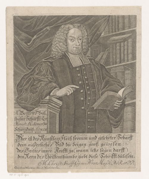 This is Moritz Bodenehr's "Portret van Christian Gerber," an engraving made around 1701. Immediately, one notices how the artist used fine, etched lines to create texture and tone. Light and shadow define the sitter’s face and clothing, lending a sense of volume to the figure. Consider how the subject is meticulously posed. The sitter is surrounded by symbols of knowledge and authority such as books and writing tools. Bodenehr's detailed line work creates contrasts, separating the dark robe against the light skin, and further defining Gerber’s figure within the architectural backdrop. The composition uses these contrasts to draw attention to the book Gerber holds, suggesting an interaction between his intellect and the written word. The lines of the engraving emphasize the formal qualities of the composition and reflect the cultural values attached to intellectual portraiture. As a result, this artwork invites not just admiration of the artist's skill, but also questions about the relationship between image, identity, and power within its historical context.