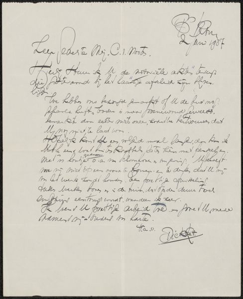 Curator: Today we're looking at "Brief aan Peter Vos," possibly created in 1957 by Kees van Strien. It’s an ink drawing on paper. Editor: It feels so intimate. Looking at it, I immediately feel this sense of urgency, but also a deliberate care with each word, a connection being forged in real time. What are your initial thoughts on it? Curator: Indeed, the handwritten script immediately brings forth the artist’s voice. We see in it the echoes of Golden Age correspondence, though rendered here with a modern sensibility. It has the directness of a personal note, a familiar format, which invites a certain closeness. Editor: It’s more than just closeness—there’s vulnerability here, too. In the content I feel a plea or call, a reliance and relationship that speaks volumes of the artist in his time. The labor itself is striking, as are the words on what may be deeper social and artistic engagements, that feels incredibly salient given its possible time period. It situates van Strien’s artistry and thoughts within, and responsive to, specific cultural shifts. Curator: You bring up a great point about the text’s socio-historical framework. The use of language echoes traditions that place van Strien squarely within his cultural lineage; still the use of casual, colloquial terms disrupt the expected experience—giving it that intimate sensibility you rightly call our attention to. The symbolism of his act, that of the written word, is important; it has a tangible, permanent feel. Editor: Yes! Each sentence feels like it’s building towards an intended reaction or connection with its receiver; the text serves a specific interpersonal, communicative, even activist, intention that brings history into the here-and-now, creating an invitation for conversation. What the letter says is as impactful as how and why. Curator: What resonates with me is how we glimpse, within the script's formality and urgency, a bridge. The content becomes secondary; rather we note that connection can take form from cultural lineage and shared spaces. The images themselves act as a message or reminder across space and time. Editor: For me, what endures is that art such as "Brief aan Peter Vos" continues to prompt questions about influence, intentionality, and connection, but also access across generations of thought—allowing for radical new ways to understand history, theory, and our own present-day cultures.