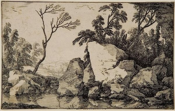 Editor: This etching, "Branch of a Tree" by Allart van Everdingen, has such a wonderfully bucolic feel. The landscape seems to stretch out before us. What symbols or cultural echoes do you see in it? Curator: The tree itself is a potent symbol. Note how its branch, reaching yet incomplete, frames the scene. Trees often represent the cycle of life, death, and rebirth across cultures. This particular framing invites us to consider our own place within that cycle, and the potential for growth, even amidst decay. Editor: That’s fascinating! I hadn’t considered the framing aspect so literally. Curator: Consider also the distant building. Is it a castle, a church? What does its presence at a distance suggest about power, faith, or the limits of human ambition when viewed from the organic world? Editor: This etching really opens up a lot of questions about our relationship with nature. Curator: Indeed. It's a reminder that art, like nature, is rich with layered meanings if we take the time to look closely.