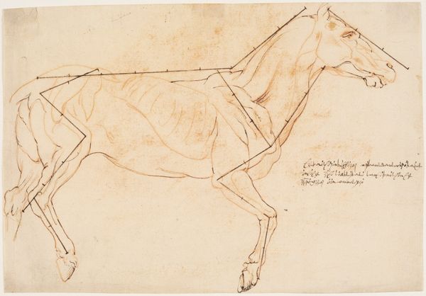 Editor: We’re looking at George Stubbs’ “Tiger Body, Lateral View,” a drawing made sometime between 1795 and 1806. The anatomical detail is striking, even unsettling. What strikes you most about this piece? Curator: Immediately, the network of lines commands my attention. Notice the layering: the confident contour of the tiger juxtaposed with the intricate roadmap of veins, sinews and musculature meticulously etched beneath. It's a study in contrasts: power and vulnerability, surface and depth. What visual relationships do you observe between these layers? Editor: I see how the precision of the anatomical lines undermines the overall image of the tiger. It is a living being dissected on the page. Almost diagrammatic... Curator: Precisely. Consider the formal structure. The lateral view presents a controlled perspective, allowing for a systematic analysis of the animal form. How does this detached viewpoint affect our engagement with the subject matter? Does it evoke empathy, or does it encourage a more clinical observation? Editor: I think it’s a little bit of both, I feel empathy, yet the detail prevents any true connection, if that makes sense? Almost too much information... Curator: An astute observation. Now, let’s consider the materiality of the work. The drawing medium, with its inherent capacity for linearity and tonal variation, perfectly complements Stubbs' meticulous approach. What effect does the limited palette have on our perception of the tiger? Editor: Without color, the focus is entirely on the form and line. You see the work as line, tone, and form and it's pure impact of technique on what it means. Thanks so much. Curator: A fruitful discussion. It's always revealing to observe how different perspectives illuminate distinct facets of a work.