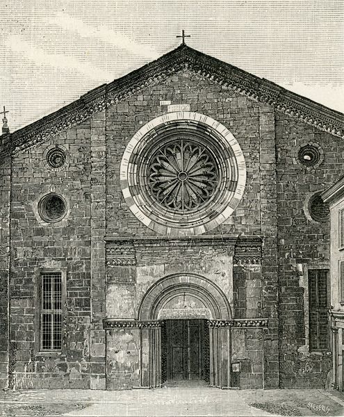 Curator: Before us is an engraving from 1892 by Giuseppe Barberis entitled "Cattedrale Di San Michele," showing the facade of the church. Editor: There's a solemn quality, an aged monumentality. The detail captured in this rendering of the stone work and carvings is stunning. You can almost feel the weight of history pressing down on you. Curator: Indeed. Consider that Barberis executed this engraving at a moment of immense social and political upheaval in Europe. What continuities, or breaks, might a depiction of Romanesque and Renaissance architecture signify in the face of rapid modernization and shifting power structures? Editor: It is an invocation of tradition, of permanence. The carefully rendered architectural details become almost like symbolic armor. Look at the Romanesque blind arcades and the Renaissance doorway decorations; they project power but also speak to spiritual continuity. This church, even just its depiction here, acts as a grounding force, perhaps, a place of stability during a turbulent era. Curator: I agree that it offers a powerful vision of tradition. However, one might argue that this visual consolidation, these various architectural styles blending, reinforces a hegemonic narrative, flattening distinct historical moments to promote a specific ideal of Italian identity during the Risorgimento. The image promotes power in an idealized fashion, silencing marginal perspectives. Editor: An interesting and valid point. Although, even within the image's grand statement, individual details continue to communicate. Those sculpted figures flanking the semi-circular tympanum above the central portal carry weight. Perhaps these represent not power, but virtue or specific beliefs meant to subtly instruct. Curator: Your reading opens a valuable avenue for exploring the function of public art and architecture. Even within this static representation, such spaces are rarely ideologically neutral; instead they are battlegrounds in the negotiation of power and meaning. Editor: Thank you. It reminds us that images of buildings are, after all, charged vessels carrying layered meaning. Curator: Yes, the layers expose that the "Cattedrale Di San Michele," although seemingly set in stone, contains echoes and reflections of ever-changing forces.