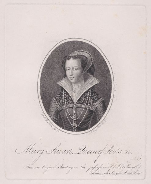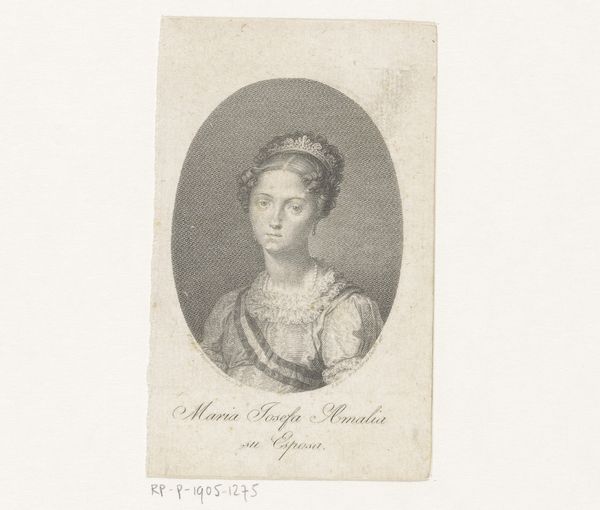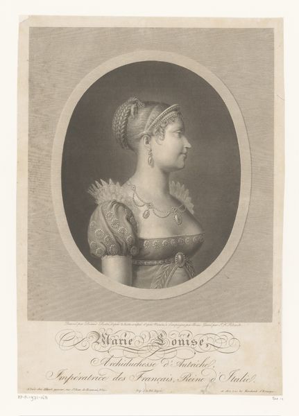 Editor: Here we have a portrait of Maria Ludovika Beatrix von Österreich-Este, made in 1808. It's an engraving. What strikes me most is how this old engraving style gives a strong sense of history. What symbols or meanings jump out at you? Curator: Well, first consider the oval frame. It's a visual device that immediately evokes classical antiquity. What emotional associations do you connect with that form? Editor: It feels very formal, a bit constrained. Curator: Precisely! Now, look at the pearls in her hair. Pearls, throughout history, have symbolized purity, but also tears. Here, do you see them hinting at the weight of her royal status? Editor: That's interesting. I hadn't considered the pearls as carrying a double meaning. Curator: And note her gaze, direct and seemingly unwavering. Consider, then, how portraiture of powerful women serves a dual purpose. What stories do you imagine are being told about her and to her audience through such features? Editor: I guess the direct gaze projects authority, but the pearls soften the image, suggesting both power and vulnerability. Curator: Indeed. The symbols chosen construct an identity and negotiate the complexities of power and expectation. Thinking about it this way, how might one begin to decode images more consciously? Editor: I see that analyzing the symbols, materials, and the overall context can unlock hidden cultural narratives in a portrait. Thank you for sharing your expertise on symbolism! Curator: My pleasure. Remembering that every artistic choice holds meaning transforms how we experience images from the past.