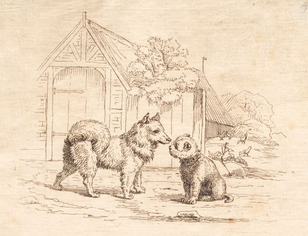 Curator: Right, let’s take a closer look at this delicate engraving. It’s titled "Illustration til 'Halvhundrede Fabler for Børn' af Hey," dating back to 1834, by Martinus Rørbye. Part of a series illustrating fables, you know, tales intended for children. Editor: Well, instantly I’m charmed. There's a beautiful, gentle playfulness in it. The linework creates such a soft texture, it’s like peering into a storybook dream. You've got this exuberant goat seemingly leaping at a very game-looking dog. I almost hear laughter. Curator: It's interesting that you mention dream, because Romanticism—with its focus on emotionality, intuition, and also this kind of fascination with the naive--is at play. Rørbye’s piece would be seen as a fine example of genre painting mixed with academic discipline. Think about who would be seeing this image...children and families. There’s something radical about presenting what would seem to be "high art" to a juvenile audience. Editor: High art for wee ones! But yes, I see that academic rigour you're pointing towards. The animals are depicted with precise observation, even in their playful stances. Yet, at the same time, they seem imbued with character. The artist clearly understood not just their anatomy, but their personalities, their interactions. Curator: Absolutely, it served both pedagogical and aesthetic functions. The very act of illustrating fables suggests a belief in the moral value of art for young minds. In this image, the line serves as a container for all sorts of complex cultural and ethical information about relationships, expectations and…entertainment. Editor: Which makes me wonder...what was the fable about? Is it about friendship? A test of courage? Or a warning against being too headstrong, in the goat's case? There is such beautiful visual storytelling here, a kind of miniature drama. Curator: Precisely. I think that duality makes the artwork resonate even now. And it prompts you to consider broader questions about the use and abuse of pictures...as Rørbye clearly knows they matter. Editor: Well, I leave wanting to write my own fable now, inspired by this little landscape. Such evocative work.