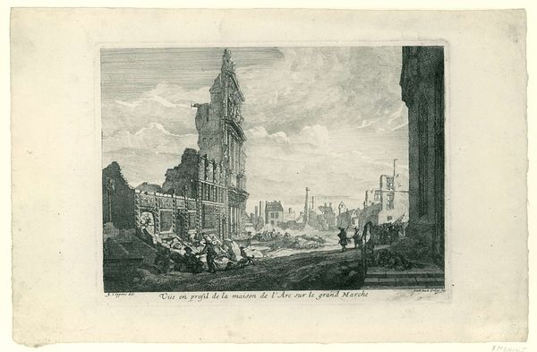 Curator: Immediately I’m drawn to the light; it's somehow both diffused and incredibly directional, creating these sharp contrasts that pull you into the scene. Editor: Yes, that play of light is extraordinary. We're looking at "De Santa Maria Gloriosa dei Frari te Venetië" by Michele Marieschi, an etching dating to 1741, housed right here in the Rijksmuseum. What strikes me is its capture of a very specific moment in the social life of Venice, with the Frari church as a kind of backdrop. Curator: Absolutely. The church looms large, not just as a religious edifice but as a silent witness to daily Venetian life. The figures bustling about… do you see a subtle air of mercantile energy, almost theatrical, woven into the fabric of the cityscape? Editor: Precisely! Venice, at this point, was a liminal space – caught between its glorious past and the pressures of emerging global capitalism. Marieschi’s work, particularly through the engraving medium, allowed for wider dissemination, feeding into the exoticization, and commodification of the city. I mean, just observe how class is displayed on the stage he crafts—the privileged ascending those steps, the workers on the waterfront, even in repose! Curator: The perspective is really incredible. This visual dynamic isn't only an aesthetic device, it creates a world where everything appears balanced and considered; is this, perhaps, Marieschi consciously positioning the church, and maybe by extension religion, as an organizing force? Editor: Or a romanticized projection? The Baroque period was all about spectacle and persuasive power. Perhaps it uses that religious space as a form of state control projected out to citizens or wealthy consumers, almost like subtle propaganda for an imagined Venice. Also notice how Marieschi emphasizes certain buildings with sharp angular shadows—almost violently graphic! Curator: Fascinating observation. That juxtaposition of divine presence and worldly activity encapsulates the Baroque aesthetic: the spiritual intertwined with the human. Editor: I agree that it beautifully demonstrates Venice as a site where public spectacle blends with individual lives, religion intersects with commerce, and history continually collides with a constantly transforming present. I look forward to lingering longer on this tension that Marieschi seems keen to represent! Curator: And, certainly for me, this close observation reconfirms art's potent capacity to be far more than just an image. It’s a portal to understanding values.