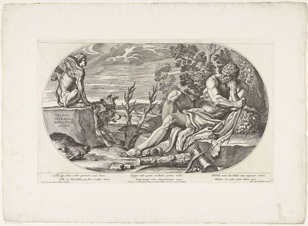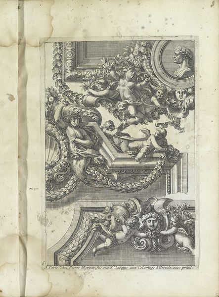 Curator: This is Pietro Aquila’s "Galeriae Farnesianae: Hero and Leander," created around 1690. It’s a complex engraving, isn’t it? Editor: Absolutely! It evokes a feeling of classical drama, almost operatic in scale, despite the small figures. The composition is so dense. Curator: Note how Aquila uses the framing devices to create distinct spatial planes and draws our eye across the page. The interplay of light and shadow is also remarkable. Editor: Yes, and the myth of Hero and Leander is so powerfully realized here. Leander's desperate swim towards the tower, a beacon of love. That beacon also represents hope amid despair, don't you think? Curator: It is a visual representation of yearning and the tragic consequences of unyielding desire. The engraving medium itself contributes to the graphic tension, doesn't it? Editor: Precisely, and seeing it now, I'm struck again by the enduring power of symbols to tell such potent stories. Curator: Indeed, and the enduring sophistication of Aquila's technique invites continual revisiting. Editor: A perfect example of how art can capture the eternal struggles of humanity.