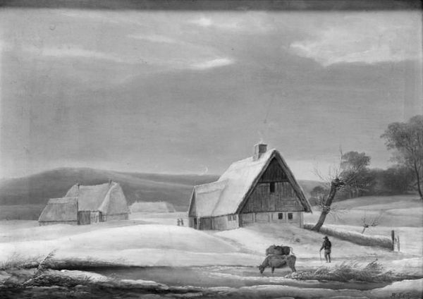 Curator: Look at this captivating piece by F.M.E. Fabritius de Tengnagel titled "Winter Landscape with the Manor House Gisselfeld", painted in 1837. Editor: It evokes such a stark, almost dreamlike quality, doesn't it? The limited palette amplifies the chill and isolation of the scene. I immediately think about the societal roles manifested through the built environment and the implications that carries. Curator: Tengnagel paints a landscape dominated by Gisselfeld, a manor which, of course, symbolizes power and wealth. Winter transforms this power structure as it enforces hardship on the population that keeps such structures intact. Think of the laborers and tenants during such seasons. Editor: Yes, and what of the artist's process in constructing this image? Did he grapple with portraying these social inequalities directly, or was the aim to solely celebrate a wealthy landowner and his estate? And were the materials sourced locally, thus embedding the labor and geographic conditions within the work itself? Curator: Interesting points, especially given Tengnagel's potential access to high quality pigments versus what might be accessible to peasant artists during the time period. I feel he tries to connect the human element to the environment with those tiny figures skating on the ice or walking the grounds. We can delve into those people’s own lived experiences shaped by factors like class, gender, and access. How did the socioeconomic hierarchies of 19th-century rural Denmark impact their everyday lives? Editor: Those figures feel quite distant, almost aesthetic elements enhancing the grandeur. How might that impact our ability to see past such representation in examining the piece’s material reality and societal implications? And could the work actually reinforce those existing power structures through romantic idealization? Curator: I think engaging with these kinds of critiques encourages visitors to ask broader questions of their viewing experience. Editor: Absolutely. The piece really provides so much more than what meets the eye. I'm thankful for being able to closely think of it in materialist terms. Curator: Likewise, examining art through lenses of social, gendered, and political power gives rise to deeper understanding, as well as engaging dialogue.