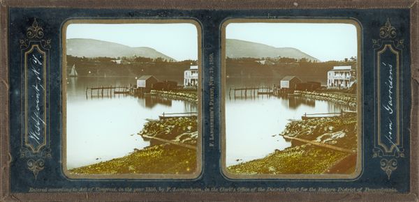 Curator: This stereoscopic albumen print offers a double view of the Danube riverbank in Budapest. Entitled "Gezicht op de kade langs de Donau in Boedapest," it dates back to 1868 and is attributed to Charles Gaudin. Editor: What strikes me is how calm and contained it feels—the tones are muted, almost sepia-toned, creating a really serene atmosphere. The composition itself is very controlled. Curator: Absolutely. Gaudin captured not just the scene, but an entire mood. The way he uses the stereoscopic effect, the slight separation between the images, adds depth—almost as if you could step right into the banks. It makes you wonder about the actual scene, if he saw Budapest this tranquil. Or whether it represents what they aspired to. Editor: That control is formal and impressive, don't you think? See how the strong diagonal of the riverbank moves through the images—almost splitting them into sections and controlling your eye. Then consider the relationship between river and bank, and city: Each mirrors the scale of the next, neatly tying it all together! I feel the way the images are assembled enhances this control in the observer’s perception of space. Curator: I get a sense that this almost romantic vision of landscape helps highlight new transportation opportunities as ships are becoming essential to a region's growth at this period. The people walking leisurely on the bank add an element of timelessness. Editor: Maybe, though I keep seeing a composition designed to convey visual dominance. And that control that I perceive is something new brought on through photography... But that romantic feel you talk about might just be me feeling nostalgic. Curator: That's precisely it. Photography freezes those fleeting moments of everyday life. A lasting snapshot. We often look to what survives in these old snapshots for clues, but as you note, their artistic approach frames not just our own memories, but the intention of a generation as they saw themselves. It also reminds us, though—how different we are as humans as well! Editor: Exactly! A lot of art is often like that: an exercise in historical perception and how we might reframe the same old, "romantic" views through new modes of critical consumption. Thank you.