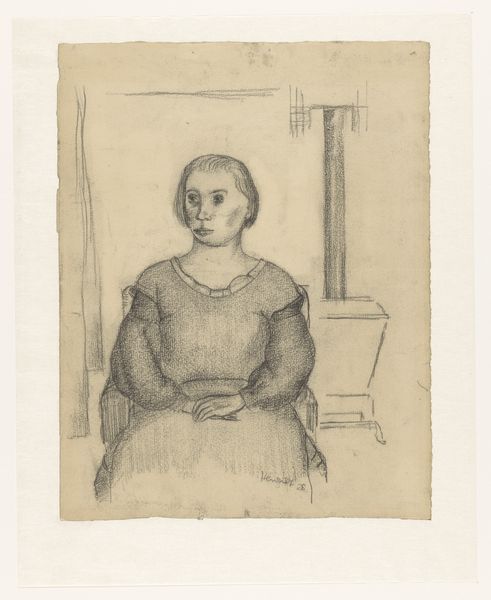 This is "Jonge vrouw met tamboerijn" by H. Becker, an etching on paper. The eye is immediately drawn to the figure of a young woman, rendered with remarkable precision and depth, her gaze fixed to the left. The textural interplay between the woman and the shadowed backdrop is striking. Notice the contrast between the smooth, almost porcelain-like quality of her face, achieved through delicate and controlled lines, and the dense, chaotic strokes that define the background. This contrast serves to isolate her figure, emphasizing her form, while simultaneously creating a sense of unease or uncertainty about her surroundings. The way the woman is framed is also of note. She is positioned within a self-contained border, which may signify a detachment from broader social contexts. Consider how Becker’s deployment of etching techniques encourages a visual dialogue about the role of women. Art, here, becomes not just a representation but also an interrogation of societal norms.