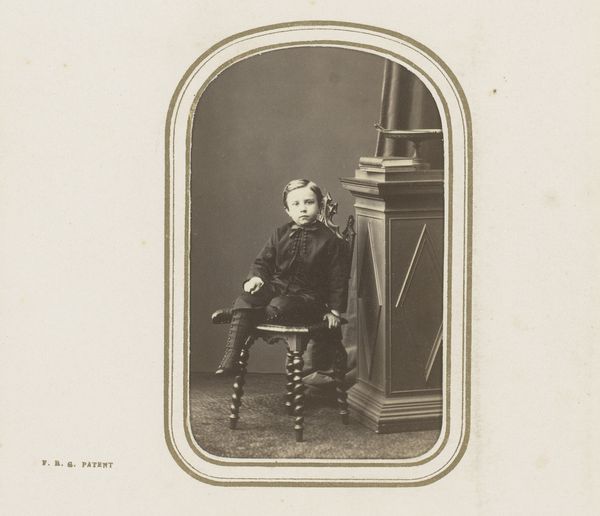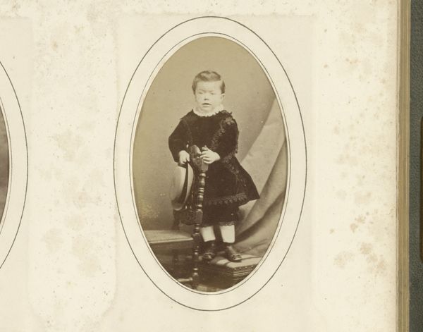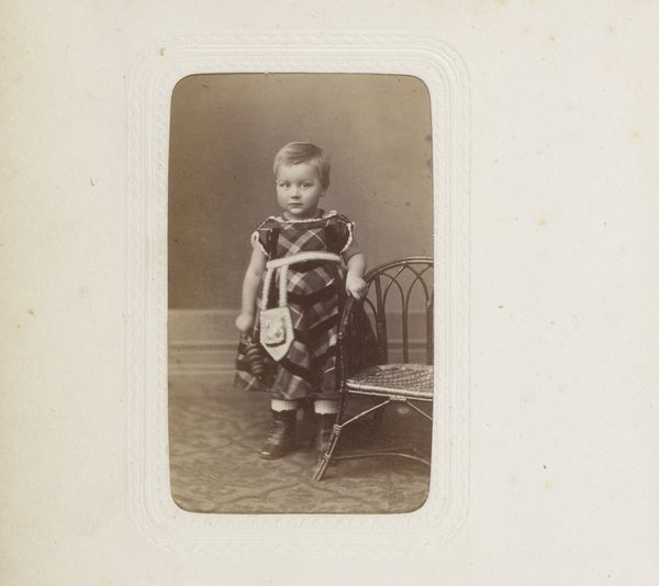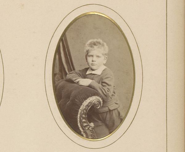 Curator: The melancholy emanating from this albumen print is quite potent, isn’t it? The portrait is of a young boy with a hoop, taken in 1898 by Michel Berthaud. Editor: It is! There's a sense of stillness, almost of entrapment. The muted tones emphasize a melancholic sentiment; even the child’s gaze feels heavy with a seriousness that belies his age. Curator: True. I find it difficult to know what to make of his gaze – it’s difficult to connect with him and find a lighthearted, playful quality in the image, though the toy suggests it ought to be there. Editor: Precisely! Considering the broader context of the late 19th century, childhood was idealized, but also subjected to rigorous standards and discipline. I wonder about the burden of expectations placed upon children of this era, the pressure to perform, to embody respectability. His stillness speaks to me of conformity. Curator: Do you think it’s a form of defiance, then? I wonder if the boy's sombre appearance isn't only an expectation, but rather a genuine representation of him in that time? Maybe that was a happy time! Editor: Or maybe neither is true! We must allow for nuance! I find myself curious about what happens beyond the frame. Is the boy performing adulthood, or simply biding his time until childhood play? Considering Berthaud's probable background in commercial photography, it's important to reflect on how societal pressures shape identity. The subject must hold some of those considerations, regardless of whether the little boy likes it or not. Curator: You always drag me back into the socio-political currents! And yes, here, that context adds some serious weight. Still, as a creative, I wonder whether the magic lies more in Berthaud capturing some unknowable truth, however weighty. The photo somehow embodies the complexity, don't you think? Editor: Absolutely. A beautiful convergence of art, social context, and a fleeting moment of boyhood... laden with the expectations of time, perhaps. Curator: Perhaps. I think this conversation will give me more to ponder next time I find myself spinning my hoop. Thanks for that! Editor: Always! This piece has nudged me to interrogate historical frameworks... something I'm perpetually thankful for!