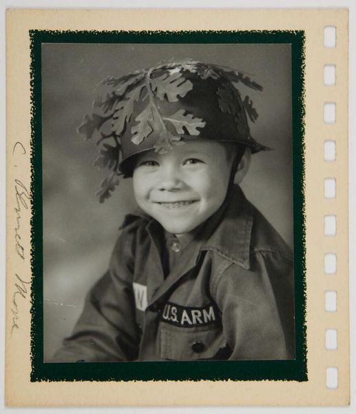 Editor: This gelatin silver print, titled "Boy's Club Heavyweight, 9-year-old Robert Sampson, Barney Neighborhood House, Washington, D.C.," was taken in 1948 by Arthur Ellis. The young boxer looks incredibly serious. What’s your take on this image? Curator: Ah, yes, young Robert… what strikes me first is the collision of innocence and experience. See those enormous gloves? They seem to swallow his small frame. He’s got this world-weary gaze, though, hasn’t he? It's a really affecting juxtaposition. The soft light wrapping around him makes it hard not to empathize. Editor: It’s interesting that you point that out because when I see this picture, I focus mostly on how mature he seems. And the composition draws all my attention straight to his face, it commands authority, but… there is a little crack, a child hiding under the surface, wouldn't you agree? Curator: Absolutely, that flicker! Ellis captures it brilliantly. You sense this defiance but also this underlying vulnerability, the sort only hinted at within. Does the environment around him say anything to you? Editor: I didn't notice it right away, but the image presents also a glimpse of a room with what appear to be other hanging gloves, perhaps left there by others... Could it also indicate something? Curator: I am sure, that, even indirectly, this photograph says as much about that specific place in D.C. as it does about the kid. Now, considering that the photo was taken right after the end of World War II... Perhaps we could even interpret it more widely and compare it with the American identity and what being a boy represented back then. Editor: That gives me a totally different way of thinking about this picture, one that encompasses so much more than what is immediately shown. I will definitely have to spend more time reflecting upon those historical connotations. Thanks! Curator: Likewise, your interpretation opened my eyes to the subject's inherent innocence. Art is, after all, about different perspectives merging.