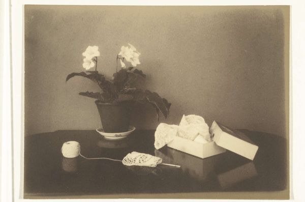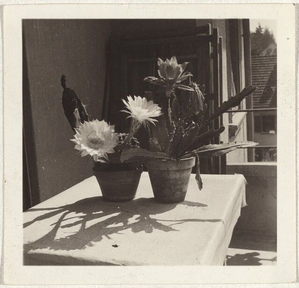 Robert Frank created this photograph, "Mabou, Nova Scotia," using black and white photography. The composition, arranged on a wooden table, reveals a simple vase of flowers contrasted against the stark illumination of a lamp. The arrangement is not just a depiction of objects, but an interplay of light and shadow that evokes a sense of quiet introspection. Frank’s choice of black and white strips away color, directing us to focus on the image’s tonal qualities, and texture. The graininess and the stark contrast destabilize conventional photographic beauty, reminiscent of his earlier work that challenged the aesthetics of mainstream photography. It operates almost as a visual semiotic system, where the stark light and mundane objects signify a deeper emotional or existential state. The formal qualities of "Mabou, Nova Scotia," extend beyond aesthetics, inviting viewers to engage with themes of time, memory, and the transient nature of life. The composition becomes a mirror, reflecting our own perceptions and interpretations, making the photographic experience deeply personal and contemplative.