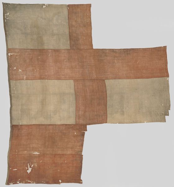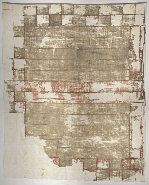 Curator: The artwork before us is titled "Fragment of a Ship Flag." It’s dated circa 1630 to 1702, and rendered with mixed media. Though unsigned, its very materiality speaks volumes. Editor: What strikes me immediately is the evident decay. It’s as if the image is dissolving before our eyes. There's this layering of horizontals broken by vertical forms, the simple geometric construction at war with its state of disintegration. It’s rather compelling in its ruin. Curator: Absolutely. Think about the original purpose: a flag flown from a ship, likely representing power, territory, identity. Now fragmented, bleached, and distressed, it presents us with an undeniable reminder of the passage of time and the fragility of such emblems. Flags are never neutral symbols. Editor: And yet, the composition retains a curious stability. Those sturdy brown horizontals ground the image, offering a sense of visual order amid the chaos of its apparent wear. Semiotically, it’s fascinating—this tension between sign and its undoing. Curator: Indeed. Consider, too, that for centuries flags have stirred national pride. As icons of cultural memory, they both unify and divide. This particular fragment prompts contemplation on power, loss, and the ultimate transience of worldly things. Look at the textures, they seem aged with layers of emotional content that are worth pondering about. Editor: The restricted palette further reinforces this sense of age, this movement away from bold proclamation towards muted remembrance. We're left contemplating the nature of representation, really, the paradox that the material object can speak so eloquently about what's absent, faded or incomplete. The scale must add impact when seeing the real artwork as well. Curator: This aged textile quietly transmits narratives of the ship that once flew it, the people it represented, the battles it witnessed. "Fragment of a Ship Flag" provides us, as the beholder, to unravel history through what remains. Editor: Precisely. What seems simple is really an elegant commentary on visibility, permanence, and representation itself. Seeing the structural remnants prompts me to think deeply on these things.