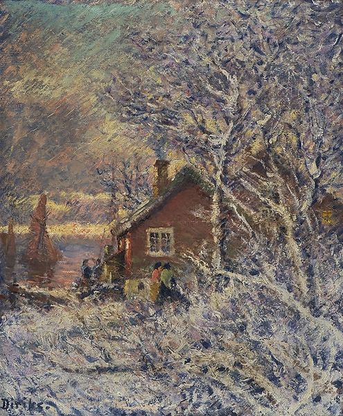 Editor: So, here we have Gustave Courbet's "Village Edge in Winter," from around 1868, an oil painting. I’m immediately struck by its stillness, that quiet, heavy snow, and I am wondering, what do you see in this piece, considering Courbet’s well known Realism? Curator: The apparent stillness, as you call it, belies the radical politics at play here. Courbet's realism wasn't just about depicting what he saw. It was about challenging the romanticized, idealized landscapes preferred by the art establishment. How might representing the mundane realities of rural life—the snow, the unglamorous buildings—become a powerful statement in its time? Editor: So, showing ordinary life *was* a statement? I guess I just assumed that landscapes, especially winter scenes, were always pretty neutral. Curator: Neutrality is a myth, especially in art! Think about what this scene *doesn't* show: no grand historical events, no mythological figures. Instead, we have a common village. Courbet is essentially democratizing the canvas, asserting the value and dignity of everyday existence, shifting art’s focus from the elite to the proletariat. Do you see any traces of that revolutionary spirit here in the brushstrokes? Editor: I see that the buildings don’t look idealized, they look weathered and kind of plain. So it’s a revolutionary act just to depict a regular village in the winter. It is forcing people to recognize beauty and value in these overlooked spaces. Curator: Precisely. And how do you think the winter season adds to this reading? How does it work within the socio-political climate? Editor: I’m thinking it’s like life slowing down. There is a stark contrast; you can see structures clearly because there is a sort of stillness and acceptance of hard realities when nature dictates terms to everyone from peasants to privileged populations. Curator: Exactly, that acknowledgement, that ‘seeing’ is what allows conversations to start! Editor: I see things so differently now. It's not just a winter scene. It’s a political act rendered in oil.