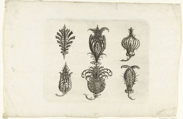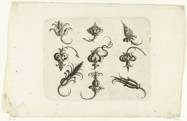 Curator: Here we have “Zeventien Bloemen,” or “Seventeen Flowers,” an etching in ink by Christoph Jamnitzer dating roughly from 1573 to 1610. Editor: Immediately I’m struck by the sheer ornamental nature of these blossoms. There’s a feeling of abundance, but also constraint, like stylized jewels frozen in ink. Curator: Precisely. Jamnitzer was working in the Northern Renaissance tradition, a time where the symbolic language of flora was deeply understood. Each flower would have carried layers of meaning related to mortality, love, virtue… Editor: So these aren’t just decorative flourishes, but almost a secret coded message? And to me it seems so connected with a culture obsessed with status and image; in some ways it resonates still now, where what you ‘say’ in clothes, home décor…all of it performs a subtle form of identity. Curator: That's a fascinating reading. The careful, almost geometric linework speaks volumes. These are archetypes more than faithful representations of nature, reflecting the humanist project of bringing order to the natural world. Thinkers of the period perceived patterns reflecting a divine plan. The human capacity to perceive it also carried divine value, reflected, refracted through objects and things… Editor: I find that controlling impulse really visible; the compositions all seem determined to work within borders – containing chaos into controlled harmony and a strong, very specific social grammar and class. So where does that place the individual voice of Jamnitzer here? Curator: Jamnitzer finds his voice in the balance he strikes between that precision and the inherent vitality of floral forms, using pattern-work and cross-hatching which adds a layer of density to create tonal nuances with a range from near-black shadows to the untouched page – Editor: It's incredible that a decorative work also echoes how so many are coded to communicate gender. Just as the blooms have controlled stems, similarly within society…that controlling structure prevails…fascinating… Curator: Ultimately, these flower studies remind us of how profoundly nature was filtered through lenses of meaning in the Renaissance. They're not just about beauty, but about our enduring relationship with the world around us and our endless search for symbolic order. Editor: These stylized flowers demonstrate just how thoroughly humans and art are coded to fit very prescriptive and often repressive frameworks, but in viewing such historical work with these points in mind is an incredible thing.