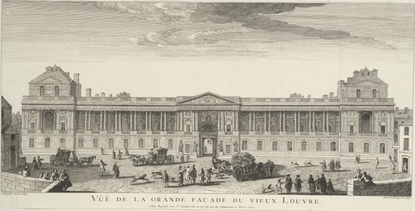 Jean-Baptiste Rigaud created this print, "Vue des Ecuries de Versailles Prise de la Seconde Grille." Notice how the starkness of the monochrome medium emphasizes the architectural forms and the bustling activity within the scene. The composition is structured around a clear recession into space. Rigaud uses linear perspective to draw our eyes from the foreground, filled with figures and carriages, towards the distant palace. The buildings and the sky above it are rendered with meticulous detail, highlighting the imposing presence of Versailles. The regularity of the architecture contrasts with the dynamic arrangement of people and vehicles. The print creates a semiotic interplay between order and liveliness, where each element serves as a signifier of the courtly life at Versailles. The formal control and intricate details not only depict the scene but also embody the values of the era. Through its structure and detail, the artwork invites us to consider the codes and the representations of power inherent in the landscape.