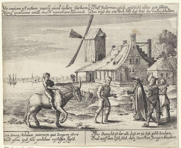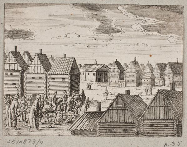Curator: Let's discuss this fascinating print, "Russisk by med mænd samlet omkring en overdækket, hestetrukken kane," created around 1647 by an anonymous artist. The work, an engraving, is currently held in the collection of the SMK, the National Gallery of Denmark. Editor: It feels remarkably brisk! The textures created through the engraving are incredibly vibrant. You can almost feel the chill in the air and the slight chaos of the moment. The varying depths of line create a dynamic field; notice, for instance, the rendering of the sky versus the tightly woven hatch marks of the log cabins. Curator: Exactly. The landscape, although minimally rendered, offers vital insight into Russian life of that era. The composition suggests an active social space: consider the clothing of the figures in the procession or clustered on the left. Note, too, the architecture, indicating patterns of habitation. Editor: And what do we make of the artist's choice to foreground specific compositional elements? The buildings have a remarkable spatial relationship, for instance, to the human forms moving across the terrain. What's also really arresting is how the forward motion almost seems staged or ceremonial; are these simply everyday activities or a significant public display? Curator: That distinction, the tension between the private and the public sphere, becomes palpable through this artist’s medium. Genre-painting like this plays such an important role in shaping both historical record and public imagination. The image seems designed to instruct. Editor: Perhaps, but is this a clear or unambiguous narrative? From a purely formal point of view, there is quite a bit of compression in the perspectival lines, which complicates its claim to objective realism. The image plane pushes and pulls, resisting being flattened, but also declining to open into a deep or plausible distance. It establishes the tension between representation and abstraction. Curator: So, the composition works through the semiotics of both a geographical place and also perhaps, of Russian-Avant Garde’s interest in manipulating visual depth to convey narrative complexity, even when using traditional genre formats. Editor: I agree, and on a material level, its stark black and white tones create a striking contrast that enhances the drama inherent in the image. These structural tensions produce a compelling visual energy. It's both beautiful and intellectually stimulating. Curator: Ultimately, a compact work that manages to touch on profound and very large societal forces while maintaining intimacy and dynamism. Editor: A fine balance struck between texture and light; context and technique. I leave here today feeling visually and intellectually satiated.