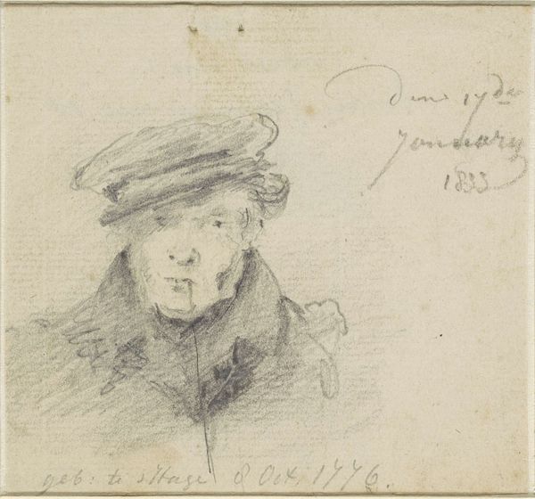 Curator: Before us is a self-portrait by Pieter Gerardus van Os. Van Os lived between 1786 and 1839. Editor: Immediately, the piercing gaze grabs you. There is also a wonderful economy of line; the detail around the eyes and face contrasted with the suggestive, looser marks around the collar is really striking. Curator: Indeed, observe how van Os employs subtle gradations of pencil to model his face, especially noting the delicate cross-hatching used to define the shadows under his cheekbones and brow. This creates a heightened sense of three-dimensionality on an otherwise flat plane. Editor: And let’s not ignore the socio-cultural signals embedded here. The jaunty cap, the smoking pipe – this isn’t the formal attire of a nobleman, is it? Van Os seems to be presenting himself as something of a common man, which seems very much in line with the art and society of his era. Curator: Quite. Van Os’s approach aligns with a rising Romantic sensibility—emphasizing emotion, individualism, and an interest in everyday life, while it challenged traditional academic portraiture that often prioritized idealized representations of nobility or affluence. His focus appears to be an exploration of the self, rather than mere documentation. Editor: The choice of pencil as a medium also subtly undermines assumptions of grandeur. Oils were for the elite; a pencil drawing makes this work feel more accessible, more grounded in everyday life. The immediacy of the medium speaks to Romantic values. Curator: Certainly. The accessibility allows a broader audience to engage with notions of artistic identity. And think about the role of art education—drawings were fundamental for teaching artists, a sort of democratization of skill. Editor: Seeing this drawing through both eyes has made me reconsider van Os and this idea of accessibility. It is nice to consider this artwork not just in terms of line and tone, but in its social messaging. Curator: Absolutely. For me, thinking about the deliberate marks in this work enriches an understanding of romanticism and its effects on the way in which individuals perceived and portrayed themselves through art.