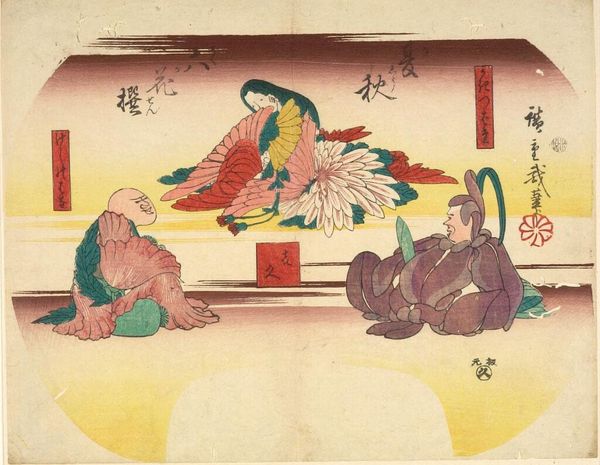 Editor: This is a print by Katsushika Hokusai, titled *Children's Wrestling Match with Hotei as Umpire*. It's hard to date precisely, but it's a charming scene. I’m intrigued by Hotei, the deity, acting as referee. What do you see in this scene, particularly in Hotei's presence? Curator: Hotei, the jolly god of contentment, is often a symbol of prosperity and ease. But here, his presence also evokes the cycle of life—children engaged in playful combat under the watchful eye of an immortal. Notice the plum blossoms, symbols of resilience, too. What memory do these symbols ignite for you? Editor: I hadn’t considered the plum blossoms in that way! It suggests a deeper connection to nature's rhythms, which are eternal, compared to our fleeting lives. Curator: Precisely. And the poems accompanying the image? They add another layer of interpretation, perhaps commenting on the scene’s playful yet profound nature. Editor: It's amazing how a single image can contain so many layers of meaning, spanning from the everyday to the symbolic. Curator: Indeed. The seemingly simple scene is a reminder that cultural memory persists through such images.