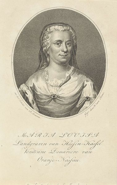 Curator: Ah, a fine engraving. This is "Portret van de dichteres Lucretia Wilhelmina van Merken," dating from 1787 to 1828. The artist, Ludwig Gottlieb Portman, has rendered the poet in exquisite detail. The artwork resides here at the Rijksmuseum. Editor: She seems amused by something! Look at that tiny smile. It's almost like she's about to share a mischievous secret, or a brilliantly sarcastic poem. And that elaborate cap – like a frothy little fortress for her head. Curator: Indeed! And observe how Portman, working in the Neoclassical style, uses crisp lines and formal composition to enshrine Van Merken. The inkwell and books are standard portrait iconography for intellect and learning, naturally. The paper medium itself echoes the textual world in which she flourished. Editor: All very poised and dignified…and yet there's a kind of restrained chaos bubbling beneath the surface. All those tight, cross-hatched lines! Almost gives the impression of her immense and slightly overwhelming thought process materializing visually on the plate, don’t you think? A beautiful and restless soul in the rigid grid. Curator: Fascinating perspective. Certainly, one cannot ignore the density of marks used here to define light and shadow. Remember too that Van Merken was a major figure in the Dutch Enlightenment. Those symbols of intellect are also markers of a new social prominence. Editor: A powerful one, yes! And look at the tiny crown adorning that cap... Is it possible we're seeing something deeper than the literal meaning here – is there a secret claim or perhaps a sardonic remark of royal influence? It hints at a sense of self, an assertion that’s both bold and quietly subversive. Curator: Your intuitive reading allows another level of discourse, a new framework for examining and engaging with Van Merken’s identity as reflected in the image. Editor: Sometimes, I swear, those old portraits wink at you. It makes you wonder what they truly thought, not what society expected them to portray. Curator: Quite. Visual artifacts carry these whispers through time, waiting for us to decipher. Editor: It has been a total joy hearing you make those insightful analyses, the kind you don't easily forget. Thanks!