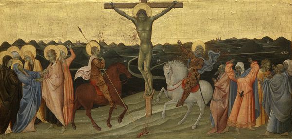 Francesco Botticini made this painting, titled “The Crucifixion,” sometime in the late 15th century with tempera on wood. The wood panel gives a solid structure for the painted image, while the tempera gives a matte, light-reflecting surface, full of subtle nuances. Botticini would have mixed his own tempera, carefully combining pigment with egg yolk and water to create a fast-drying paint. This process demanded precision, because colors could not easily be blended once applied. The smooth, detailed surface of the painting displays the work of a highly skilled artist, trained in the traditions of the Italian Renaissance. He employed techniques such as layering and hatching to create depth and modeling. The use of gold leaf for the halos adds to the painting’s spiritual and material richness. This work reflects both Botticini’s deep engagement with religious subject matter and his mastery of the craft of painting, which was so crucial to artistic production in his time.