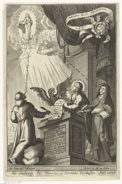 Curator: Look at this. This engraving from 1806 is titled "Allegorical monument to Prince Willem V." It was created by Jan Gerritsz Visser. It feels grand, doesn't it? Editor: Yes, almost theatrical, but in monochrome. The grey really emphasizes that classical monumentality. It evokes a profound sense of stillness and solemnity, like a stage set after the tragedy. All the symbols look almost chiseled, as in, enduring over time. Curator: You picked up on that sense of permanence, which I think is a clever artistic strategy. It utilizes allegory quite deliberately. Take, for instance, the muse poised with a stylus. Is she recording history, mythologizing it, or both? Editor: It's all tangled up, isn't it? A kind of cultural memory project right before our eyes. The figure has such a blank expression though. Is that the sadness for the Prince, or, maybe more profoundly, sadness because symbols don't do what we imagine? Because Willem V was such a controversial figure, one might guess Visser sought that universality through idealized types, right? Curator: Certainly. You notice how a weeping angel or cherub leads to the Prince. They seem to be drawing attention to the face itself; however, the rest is largely iconography. Note the open book symbolizing wisdom. A chart on the side seems like something that grounds his power. Editor: That open book resting atop the chart strikes me. The divine authority with one hand over temporal dominion, charted and ready to go. This whole scene feels less like a memorial and more like an assertion of power, even after death. An elaborate justification etched in ink. Curator: But there is such tenderness and humanity there too. Just imagine how that image circulated—the hopes, the projections, the disappointments that people saw in it. Editor: Indeed! We have layers of history compressed onto paper—personal, political, artistic. Even after the passage of time, these symbols continue to beckon to us, perhaps provoking more questions than they answer.