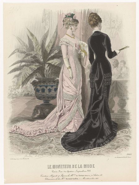 J. Bonnard made this print, L'Echo du Moniteur de la Mode, in 1871. It was created using a lithographic process, which allowed for mass production of images. Looking closely, you can see fine lines and subtle shading created by the lithographic stone. Lithography enabled the relatively easy reproduction of detailed images and text, making fashion accessible to a wider audience. The print depicts women wearing elaborate dresses, showcasing the latest trends in haute couture. Note the meticulous attention to detail in the rendering of fabrics, lace, and ornamentation. Prints like these fueled the growth of the fashion industry, standardizing style and creating a consumer culture around clothing and accessories. Consider the skilled labor involved in both the production of the dresses and the making of the print itself. Each stage, from the design and manufacture of textiles to the printing and distribution of the image, relied on the efforts of countless workers. By examining its materials, production, and social context, we can understand the complex interplay between art, commerce, and culture in the 19th century.