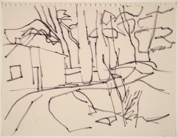 Curator: Looking at this intriguing sketch, its nervous energy grabs my attention right away. What is it about those clustered lines that makes it so restless? Editor: I find that reaction quite fitting. This ink drawing by George Bunker, simply titled "Untitled," was created around 1969. Bunker was working within the broad sphere of Abstract Expressionism at this time, a movement loaded with post-war anxieties and seeking new ways to articulate subjective experience. Curator: I see. I can feel the weight of that artistic movement and time period. It is almost claustrophobic; the lines jostle for space within the frame. They build up these frantic blocky masses that contrast with softer looping marks that suggest…figures, perhaps? Are those figures important symbolically in Bunker’s wider work? Editor: Well, it is worth noting the cultural backdrop against which Bunker developed his art: an ascendant civil rights movement, anti-war protests, and shifting gender roles were shaking up established social norms. This atmosphere permeates Bunker’s oeuvre, leading him to use symbols and fragmented bodies to express social fracture and personal trauma. Here, it almost looks as though the artist is depicting conflict itself as jumbled abstract forms rather than identifiable protagonists. Curator: Do you think Bunker purposefully echoed or responded to earlier Cubist works in his renderings of fractured perspective? I see something almost Picassoid in the breaking up of forms. Editor: No doubt that is a factor! But instead of intellectual rigor, it feels rawer and more immediate. As a sketchbook drawing, the ink carries emotional vulnerability. These kinds of lines, chaotic and overlapping, became, in the hands of the Abstract Expressionists, visual equivalents for interior states. Curator: It does indeed seem quite private and visceral. This artwork allows us to observe him working through and responding to his era with a powerful sincerity. Editor: Yes, seeing these images through Bunker's eyes deepens my appreciation of this critical era, even in this small work on paper.