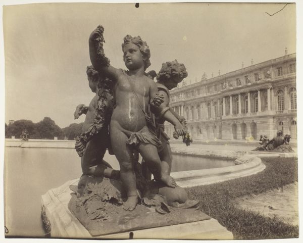 Editor: This is Eugène Atget’s “Versailles, Bassin du Midi,” a print from 1901, capturing a sculpture within the gardens. It feels so staged and serene at the same time. What do you see in this piece? Curator: Beyond the initial charm, I see a pointed commentary on power and control embedded in this landscape. Consider the choice of Versailles itself. What does this space, built to magnify the monarchy, signify to you? Editor: Well, it feels undeniably linked to wealth, aristocracy and exclusion. It was a space deliberately separated from everyday life, right? Curator: Precisely! Atget, through his lens, isn’t simply documenting the space. He’s inviting us to question the very foundations upon which such grandeur was built. Note how the light, almost uniformly diffused, softens the edges. Does this choice subvert or reinforce the rigid hierarchy? Editor: That’s interesting! The diffused light kind of equalizes everything in the frame... but isn’t the sculpture in the foreground, the focal point, still a symbol of classicism and therefore, you know, power? Curator: Absolutely. The classical figures do stand proud. But Atget might be subtly revealing the inherent contradictions within these spaces. A staged facade of freedom is revealed through what exactly? Look again. Editor: The unkempt foliage around the water's edge? Almost like nature is trying to reclaim the space... Curator: Indeed. Nature's persistence subtly undermines the manufactured perfection. The work makes me think about how art can be deployed to expose power imbalances. It's not a straightforward endorsement. Editor: I never considered that the seemingly straightforward landscape could be so charged. Curator: Atget’s photograph isn’t just about beauty; it's a layered commentary, an invitation to dissect the narratives embedded within these cultural landscapes. I learned that sometimes things can hide in plain sight if you don't ask critical questions about them.