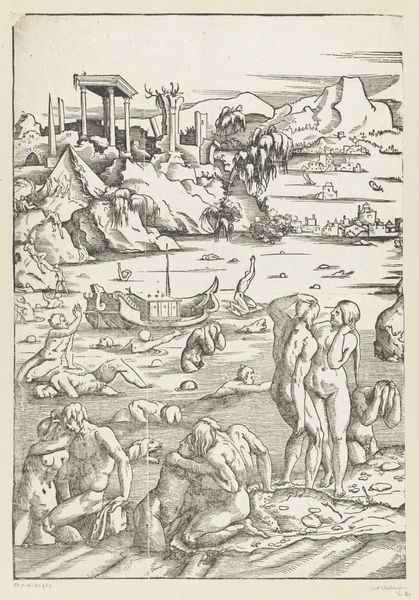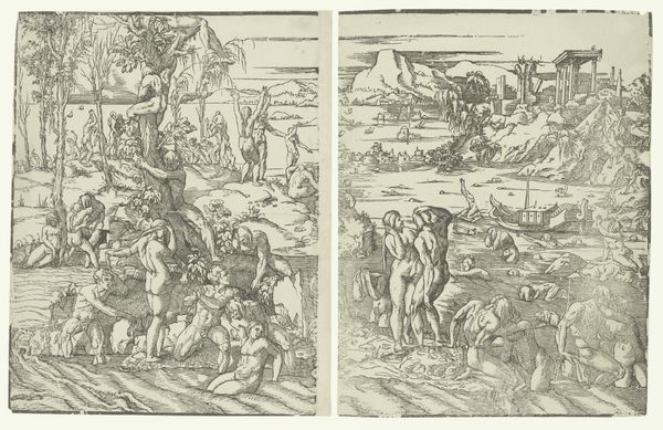 Andrea Andreani created this woodcut, titled "Zondvloed (linkerhelft)," around 1600. What strikes you first is the composition: a chaotic scene of figures, rendered in stark contrasts of light and shadow. The human bodies are intertwined with the natural world, blurring the lines between them. Andreani uses the woodcut medium to amplify the dramatic tension. Each line is a deliberate mark, carving out forms that are both muscular and vulnerable. The scene teeters on the brink of collapse. There is a structural instability, mirroring the narrative of a world undone. The use of chiaroscuro here speaks to the historical moment in which it was produced. Emerging during a period of artistic and intellectual upheaval, the dramatic lighting effects mirror the shifting perspectives of the time. This is not merely a depiction of a flood but an exploration of the very foundations of order and meaning. It serves as a reminder that art is a dynamic interplay between form and concept.