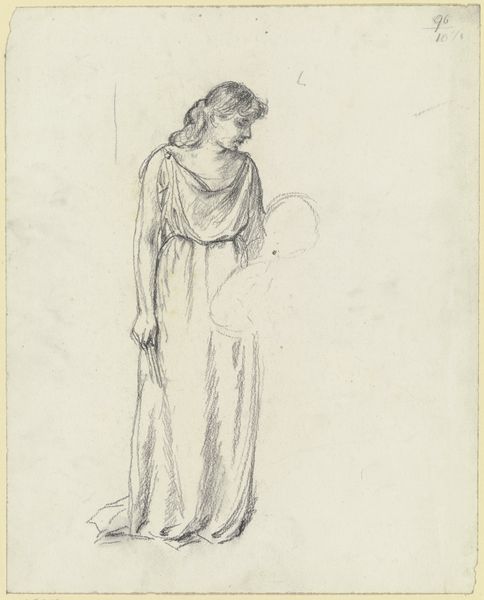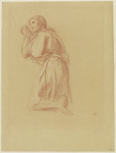 Curator: Let's spend a moment with this drawing by Pierre Puvis de Chavannes. It's titled "Zittende halfnaakte vrouw," or "Seated Semi-Nude Woman," and is believed to have been created around 1895. It's currently held here at the Rijksmuseum. Editor: There's something instantly intimate about this. The sketchy, almost ephemeral lines give it a feeling of capturing a fleeting moment, like a private thought made visible. The use of, looks like sanguine maybe, ink warms what otherwise might feel very clinical. Curator: Absolutely. Puvis de Chavannes was very interested in capturing universal themes of introspection and contemplation, often using the female figure as a vehicle for these explorations. His approach to figuration reflects the late 19th-century Symbolist movement's interest in moving away from academic realism toward inner experience. And he worked very purposefully with mural scale public works alongside private works like this drawing, to broaden arts influence. Editor: Interesting that you point that out! Knowing it may be of its time, it still makes me wonder about access in the means of making and even viewing. Sanguine lends a particular texture, it is an earthly pigment from iron oxide, suggesting a deep connection to the raw material, the drawing has an air of both the intimate and what almost reads as industrial, by its use of line quality as a form, like you said of universal exploration, rather than depiction. Curator: Well, his stylistic choices contributed significantly to his widespread recognition and influence on younger artists. He really bridged a gap, moving away from purely academic styles but influencing even early modernists through his flattened space, his quiet figures, and what was viewed as a very simplified aesthetic. The Salon loved this move into intimate domestic spheres that gave his nudes an intellectual, non-exploitative purpose. Editor: Perhaps "non-exploitative" is where we disagree. Still the raw material with all this focus makes one ponder. Curator: Fair point. Though intended for private consumption, this drawing also points to how even intimate portrayals contributed to wider societal perceptions of women. Thanks, that was interesting. Editor: Yes, getting a closer look at its materiality really shifted how I see the politics and social context around this piece. I see it less like a private expression.
