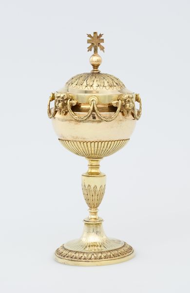 Curator: This striking object is a covered tazza, created around the late 16th century, and attributed to Pierre Reymond. It's currently held in the collection of the Minneapolis Institute of Art. Editor: It has a stark beauty, doesn’t it? Almost monochromatic. The ceramic seems sculpted, almost like a ghostly monument. The balance is impeccable. Curator: Reymond was a master of enamel painting on ceramics. Note how the contrasting dark and light fields delineate the narrative scenes, lending a dramatic visual rhythm. It invites decoding. Editor: Absolutely. The imagery is intriguing. I see figures from classical mythology, swirling across the surface. How might its commissioners have used such an elaborately decorated object? It screams elite dining and spectacle. Curator: Precisely. Tablewares became sites for expressing political ideologies. Tazzas like this weren’t just functional, they were meant to stimulate intellectual conversation at courtly gatherings. Each frieze of figures tells a story. Editor: Ah, yes. I can just imagine its patrons signaling allegiances to the erudite ideals of the Renaissance! Tell me more about this use of grisaille, the nearly monochromatic painting that gives this piece so much character. Curator: Reymond utilized the technique with incredible precision to achieve that sculptural feel you described. Its effect is highly theatrical. He was adept at translating Italianate models from painting and printmaking to this more permanent, luxurious ceramic ware. Editor: So, we can place it in a context where both technical skill and learned narrative had considerable symbolic weight. Curator: Indeed. Objects like these weren't merely decorative; they embodied a dialogue between humanist ideals, the artist's vision, and the sociopolitical functions that underscored the lives of their aristocratic owners. Editor: That tension—between the artistry of design and its manifestation of power and place—still emanates from it today, despite the centuries that separate us. Curator: And Reymond's craftsmanship transforms mundane pottery into a vessel teeming with sophisticated dialogue and display, inviting continuous examination of its compositional design.